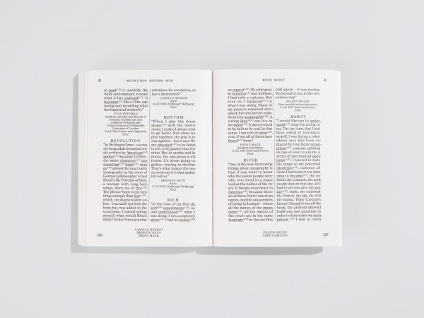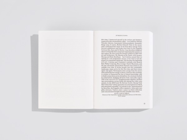 The E.A.T. Index is an alphabetically structured, cross-referenced collection of several hundred mostly unpublished statements by internationally recognized artists, architects, scientists, and writers, including voices such as Vito Acconci, Elizabeth Diller, Hamish Fulton, Thomas Hirschhorn, Emily Segal, Rasha Salti, and Lawrence Weiner. The volume is complemented by 115 images that accompany selected quotations. Engadin Art Talks (E.A.T.) was founded in 2010 by Cristina Bechtler in collaboration with Hans Ulrich Obrist, and has since convened voices across disciplines in an ongoing programme of conversations and encounters. These exchanges have taken place both in the Engadin and internationally, including cities such as London and Paris. The E.A.T. Index draws on fifteen years of these conversations, gathering this organically grown archive from 2010 to 2025 and, for the first time, making it accessible in printed form.